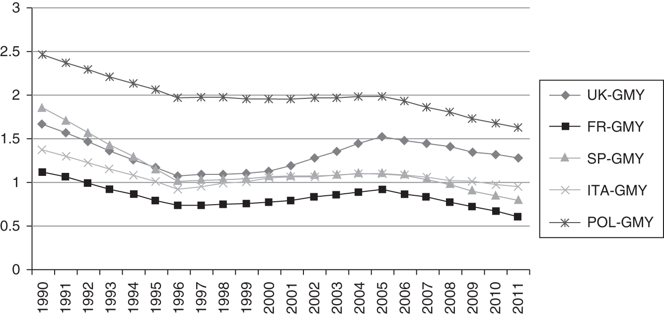 Value convergence with the regional leader and a select sample of member states is depicted in Figure 4.2 using pre-transformed values: the larger the number, the less observed value convergence. According to this figure, among the major EU countries, France is the closest country to the leader in terms of values. After France, Spain and Italy have near values with Germany. Compared with these three, the UK and Poland fall farther away from the leader. Over time, we are witnessing greater convergence among the larger EU member states.